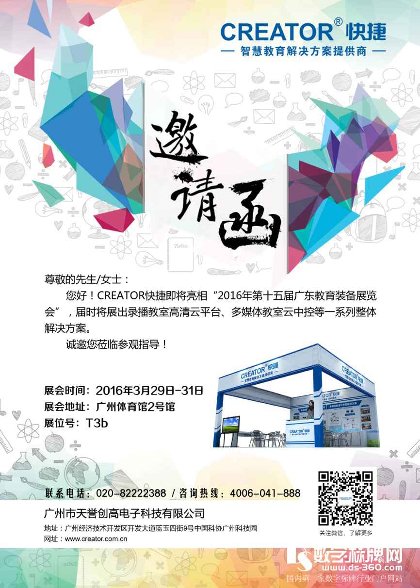 由廣東省教育裝備行業協會主辦的第十五屆廣東教育裝備展覽會將于2016年3月29日-31日在廣州體育館召開,作為中國智慧教育解決方案提供商,CREATOR快捷將攜系列技術新品及行業解決方案亮相該展會,展位號為T3b。誠邀蒞臨,共商中國智慧教育新發展。
