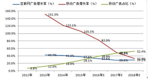 2012-2018年中國互聯(lián)網(wǎng)廣告及移動廣告市場規(guī)模增長率