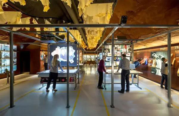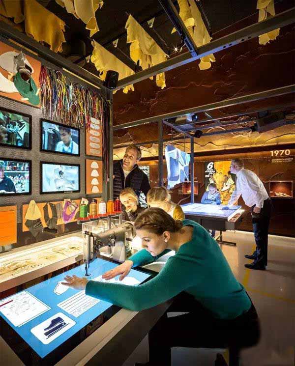 產品的制作過程在展覽中心區域展示。7個帶有互動的展示桌,從最初的設計草圖到最后的產品檢查,一步步地向游客展示了ECCO鞋子的制作過程。這種互動使游客可以親身體驗ECCO的運營,了解制作一雙鞋所需要的技能。比如,游客可以虛擬的縫制一雙鞋,而同時多媒體中ECCO的員工會講述他們是如何進行這一過程的。