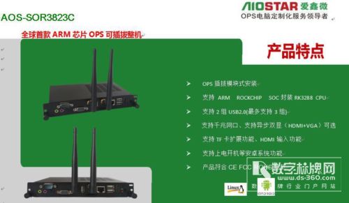 跟隨著校園數字化網絡,教學模式的轉變使得各種教育信息的表達更加生動、直觀和多樣化,為教學帶來了令人矚目的變化。相對應的OPS電腦硬件、內存和處理器整體性需求的也相對提高,在此愛鑫微隆重推出一款ARM系列OPS電腦,型號為AOS-SOR3823C,支持ARM ROCKCHIP SOC封裝RK3288 CPU;ARM芯片OPS可插拔整機,支持2組USB2.0(最多支持3組);支持千兆網口、支持異步雙顯(HDMI+VGA)可選;支持TF卡擴展功能、HDMI輸入功能;支持上電開機等Android安卓系統功能。愛鑫微電子產品可配合客戶的應用方面需求,使用需求進行定制生產。