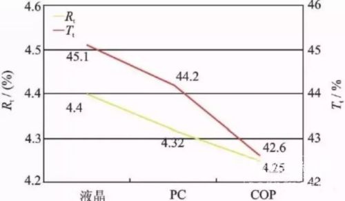 但如果結合透過率來考慮(使用相同的偏光片,透過率是45.2%),貼合液晶補償膜、PC補償膜和COP補償膜后,得到圖7為不同補償材料反射率Rt和透過率Tt對比圖,可以看出:液晶補償膜對貼合后的整體透過率基本沒有影響,而PC補償膜和COP補償膜對貼合后的整體透過率均有影響。