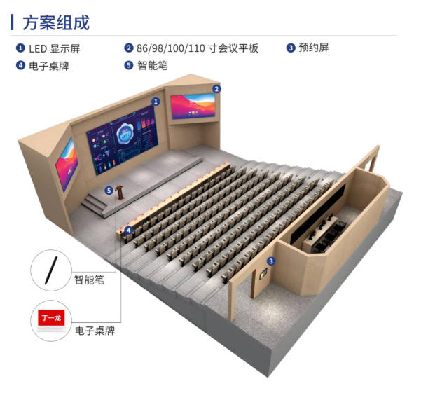以智能會議平板作為副屏,再搭配智能筆、預約屏等設備,有助于進行多種設備/系統/格式文件投屏顯示,便于演講人快速進行方案報告等內容的投屏演講。此外多功能廳還可批量應用電子桌牌進行人員信息展示,其具備多色顯示、雙面展示、綠色環保、智能護眼等功能特性,有助于打造智能無紙化的數字會議應用體驗!